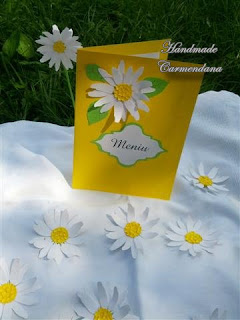 Meniu, cu margareta tridimensionala realizata handmade petala cu petala pentru un eveniment deosebit