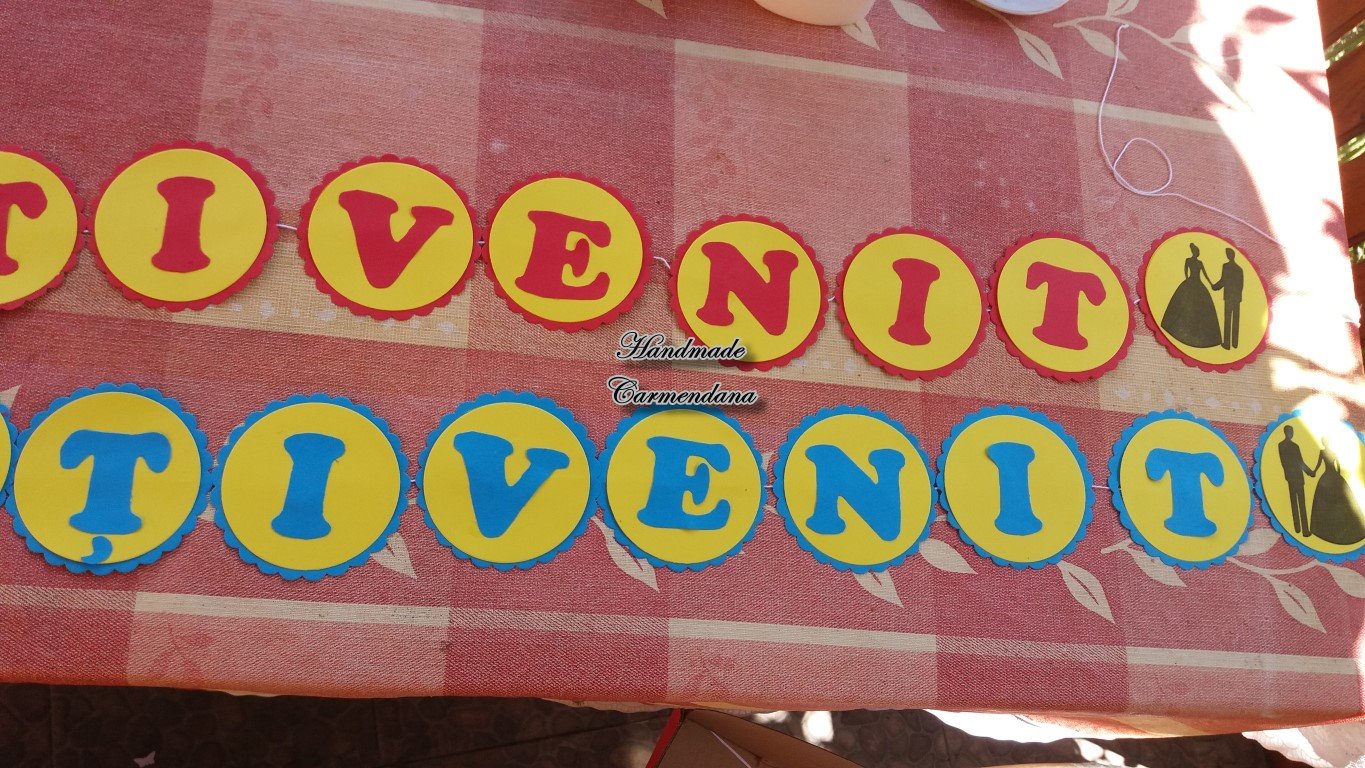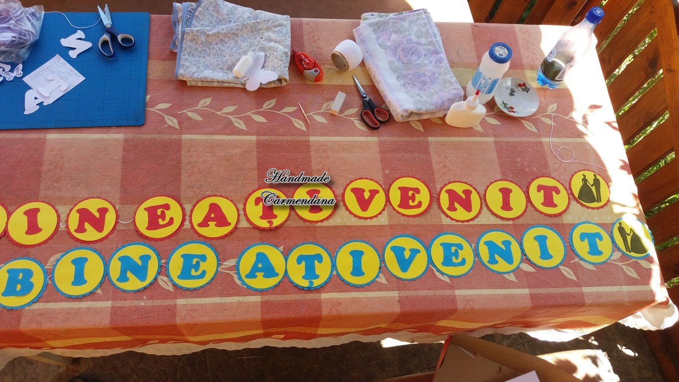 Ghirlande realizate handmade, cu mesajul "bine ati venit" pentru nunta. se pot realiza diverse teme, modele si combinatii de culori